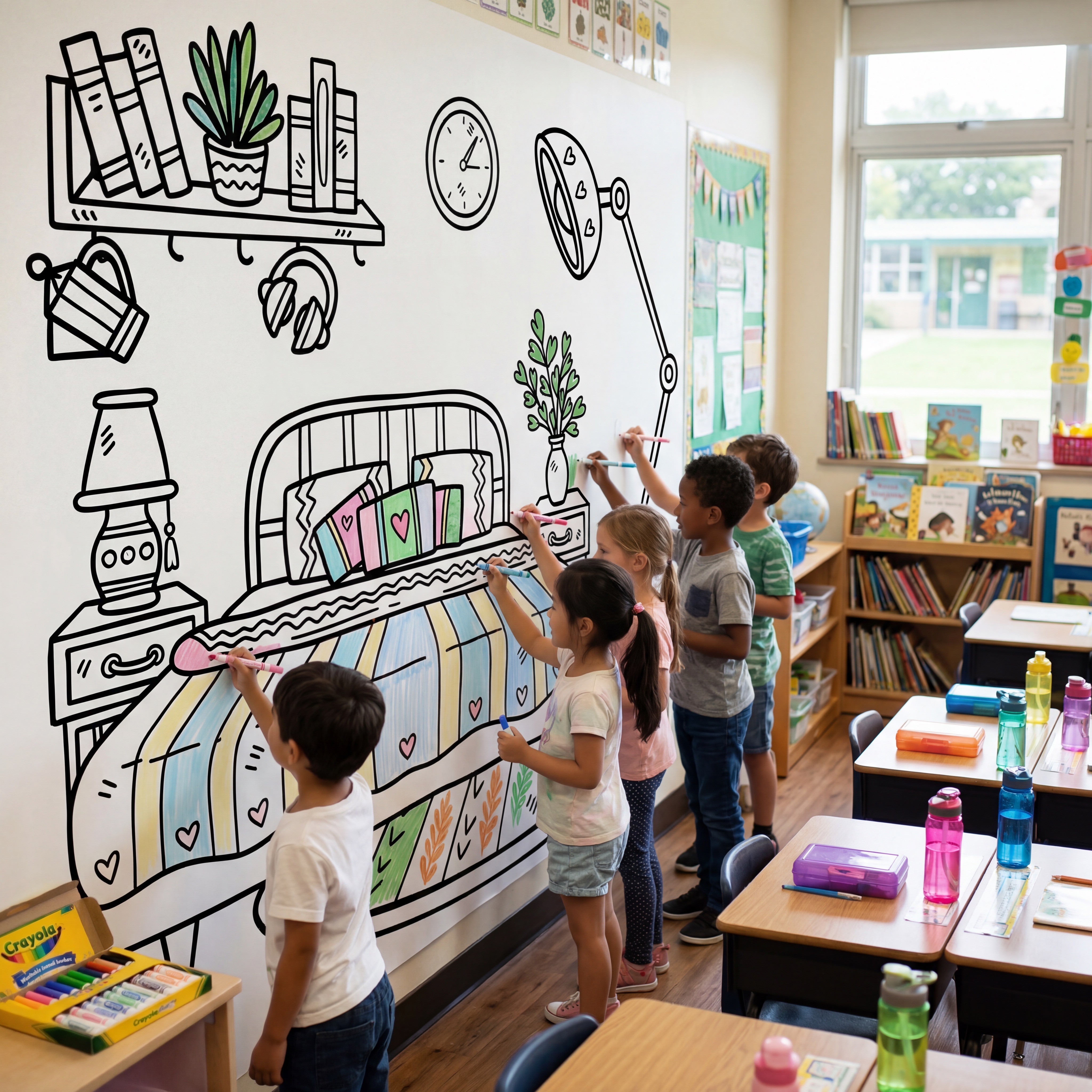 Si le mur de la classe suivait le même rythme ? Repositionnable et sans trace, le sticker repositionnable à colorier se change aussi facilement qu'une affiche. Mieux encore : on peut y intégrer les dessins réalisés par les élèves eux-mêmes, transformés en motifs à colorier sur le grand format. Un mur qui leur ressemble vraiment, conçu avec eux, pour eux et qui donne envie de venir à l'école le matin.