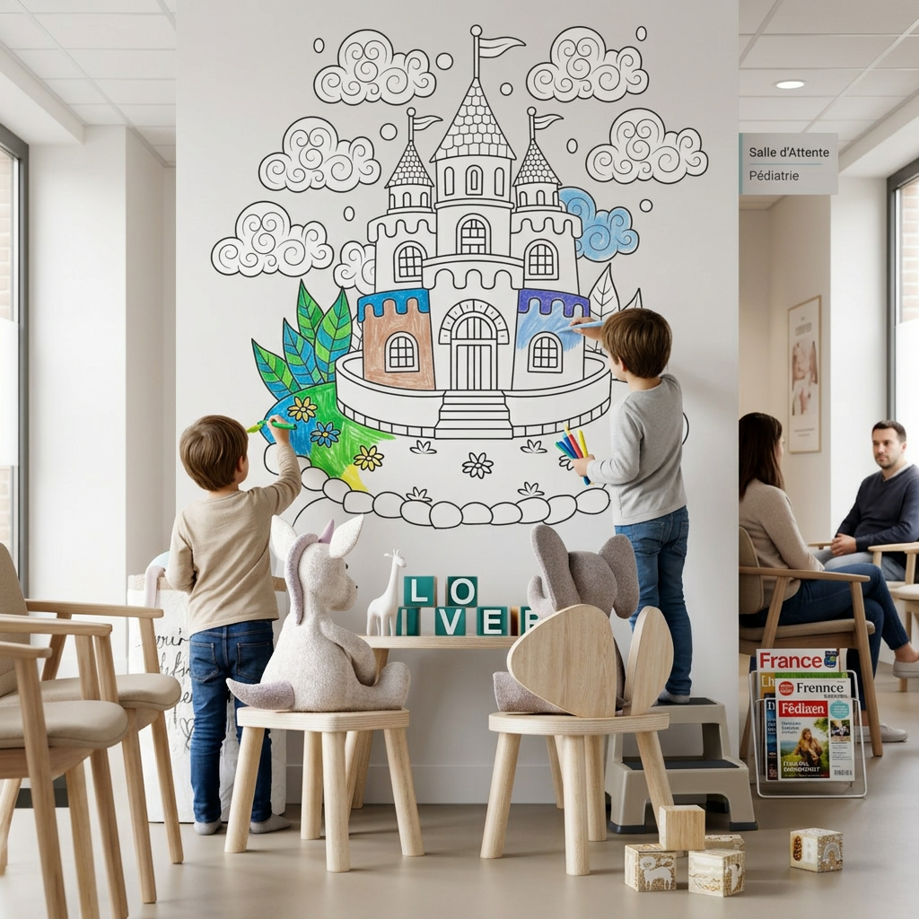Médiathèque, mairie, office de tourisme, salle des fêtes, gymnase, les espaces publics ont souvent de grands murs et peu de budget travaux. Un papier peint coloriage géant sur mesure, c'est une décoration murale participative qui s'installe sans chantier, sans colle, sans contrainte. On peut y représenter le patrimoine local, les saisons, la faune et la flore de la région et inviter les habitants à contribuer. Une animation simple, fédératrice, qui transforme un espace commun en projet collectif.