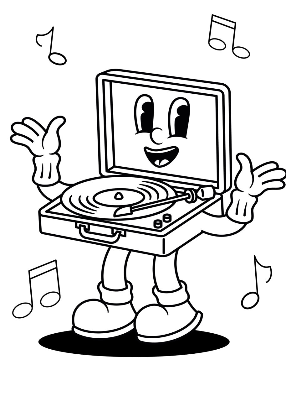 Ce tourne-disque en version cartoon prend vie avec ses bras, jambes, et un large sourire contagieux, prêt à vous suivre partout où la musique vous appelle.